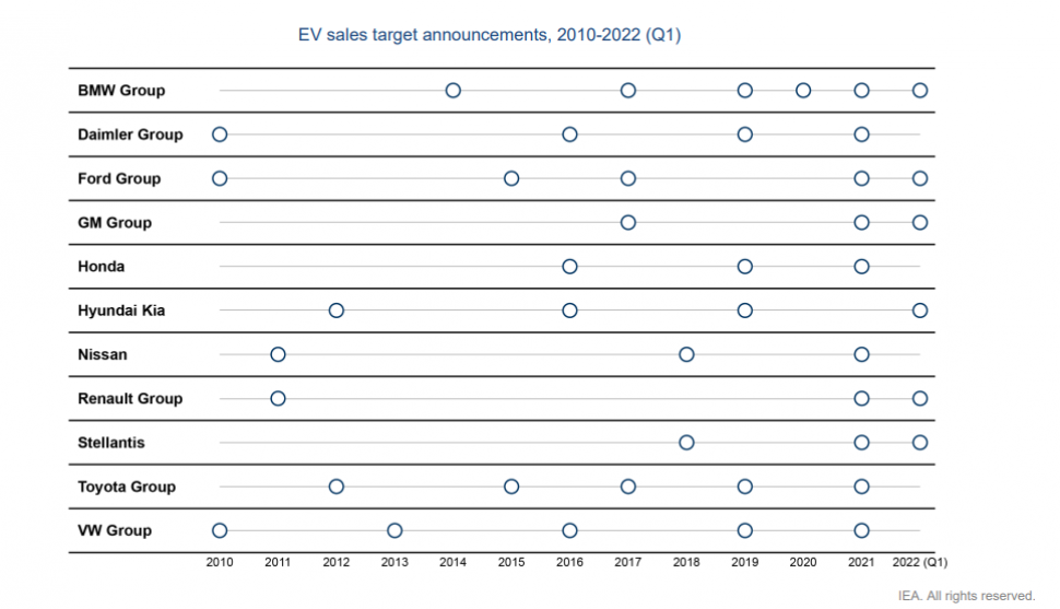 국제에너지기구(IEA)의 '글로벌 EV 아웃룩 2022' 보고서에 따르면 자동차 회사들이 전동화 판매 목표는 물론이고 내용을 발표하는 횟수도 증가하는 것을 볼 수 있다. 가장 먼저 전동화 계획을 밝힌 것은 지난 2010년 폭스바겐 그룹과 다임러 그룹 그리고 포드 그룹이다. 이후 다음해 닛산과 르노그룹이, 그 다음 해인 2012년에는 토요타와 현대차그룹이 전기차 판매에 대한 목표를 발표했다.