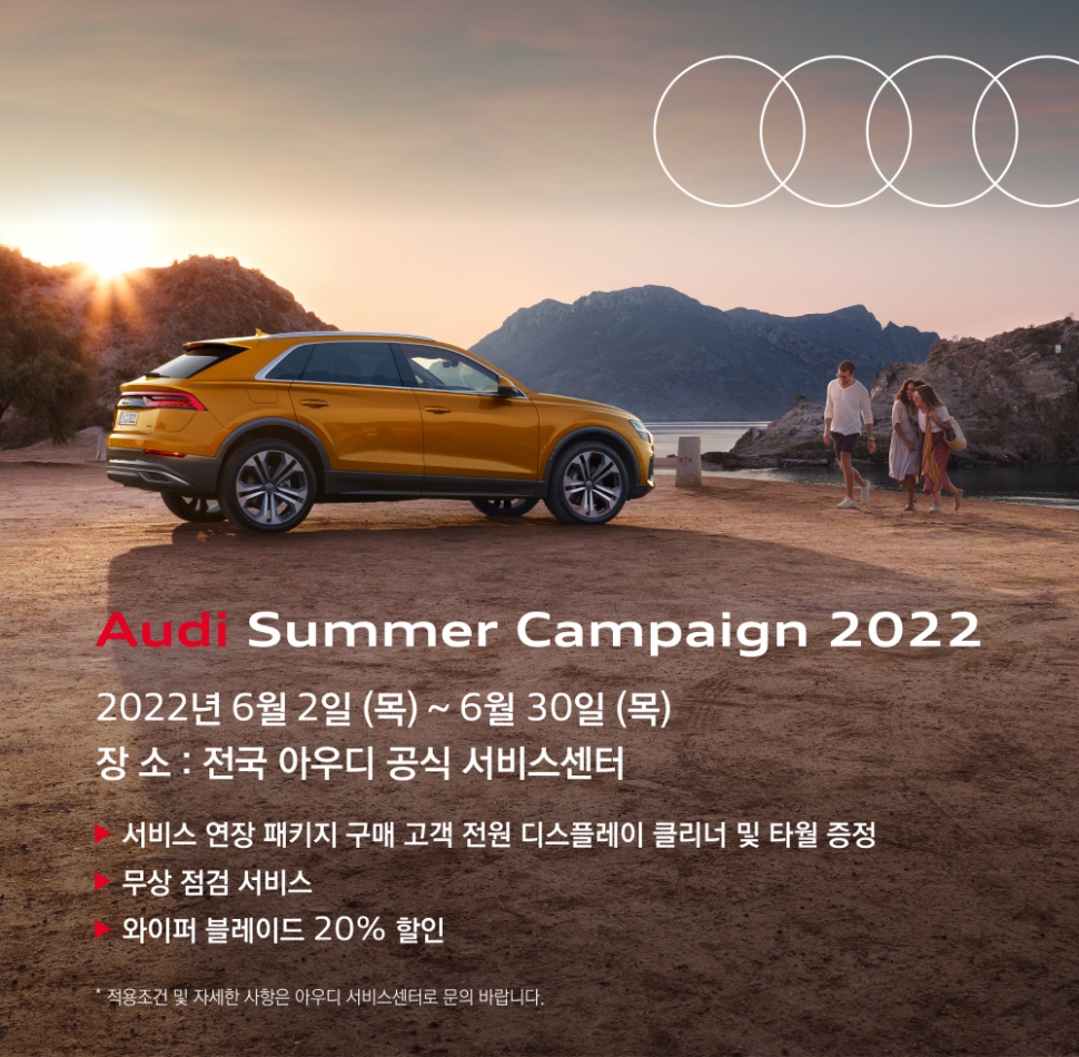 캠페인 기간 동안에는 아우디의 전문 테크니션과 최첨단 장비를 통해 타이어, 엔진, 에어컨 및 냉각장치 등 여름철 필수 점검이 필요한 13가지 필수 항목에 대한 점검 서비스를 무상으로 받을 수 있으며 장마철을 대비해 캠페인 기간 중 와이퍼 블레이드 구매 시 20% 할인 혜택을 제공한다.