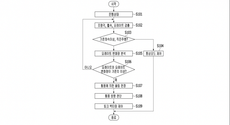 기존 기술에서는 횡풍을 감지하면 스티어링휠에 보상 움직임을 적용해 직진을 할 수 있도록 만들었지만 일정 시간 이상 횡풍을 감지해야해서 터널의 진출입과 같은 갑작스런 상황에 대응하기 어렵고 타이어의 편마모 등을 가속화하는 부작용이 있었다.