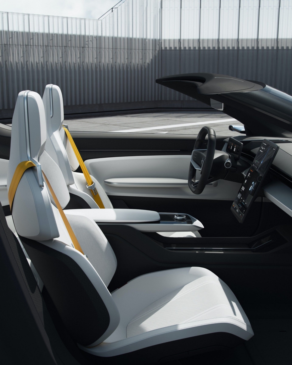 지난 3월 미국 로스앤젤레스에서 공개된 전기 로드스터 모델인 폴스타 O₂는 2+2 좌석 구조를 갖춘 컨버터블 모델이다. 낮으면서도 넓은 차체와 짧은 오버행, 긴 휠베이스 등 기존 클래식 컨버터블 스포츠카의 비율을 구현하면서도 미래지향적인 디자인을 갖췄다.