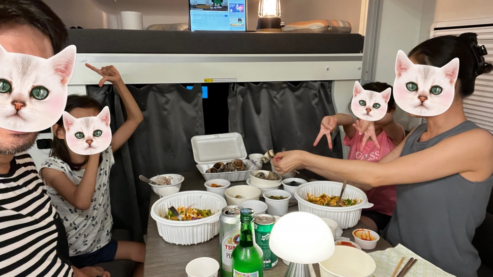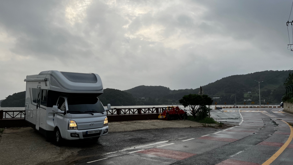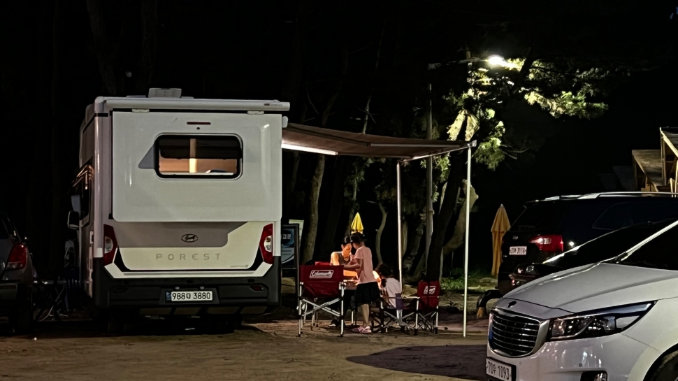 조수석 방향에 붙은 어닝을 펼치고 4인 테이블과 의자를 놓았다. 외부 LED 조명을 켜고 랜턴을 켜니 황량한 바다 앞 공간이 거실처럼 느껴진다. 바로 뒤 식당에서 주문한 칼국수와 소라 비빔밥을 쟁반 채 가져다 먹었다. 우리도 식사를 했고 사실 주변을 맴돌던 모기도 식사를 했다. 편의점에서 긴급히 모기향을 사다 켰지만 아직도 다리가 간지럽다.