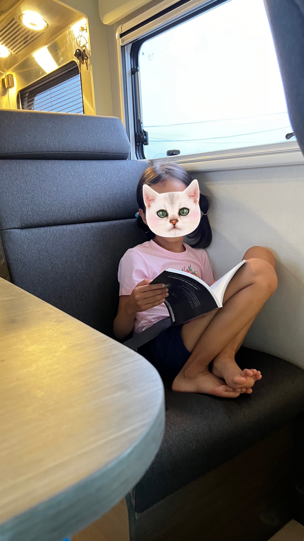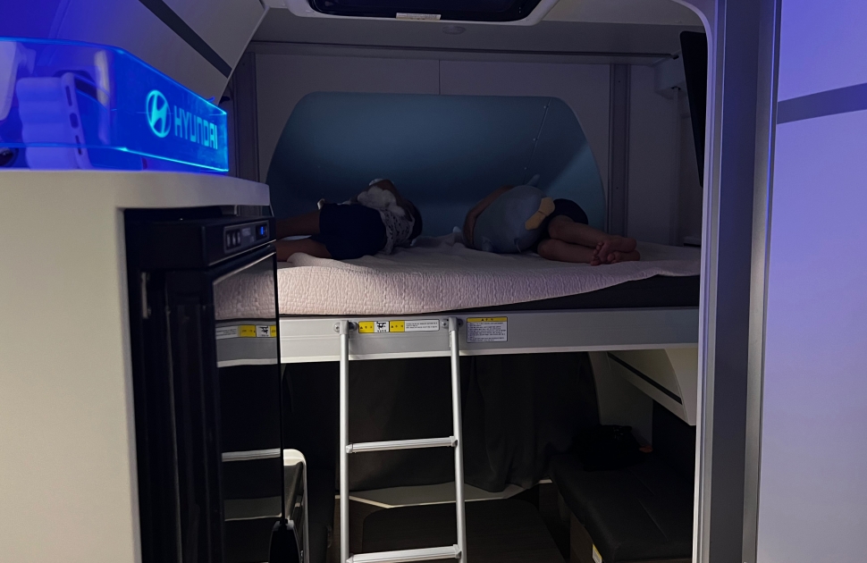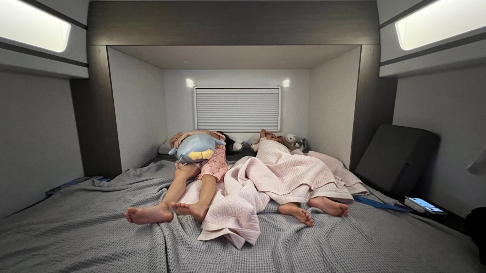 새벽 더위에 잠을 설쳤으니 낮잠을 청하기로 했다. 차를 한적한 곳에 멈추고 스마트룸과 스마트베드를 펼쳤다. 스마트베드는 거실 공간 위에서 내려오는 이층 침대다. 이층 침대가 열리자마자 아이들은 후다닥 사다리를 타고 올라간다.