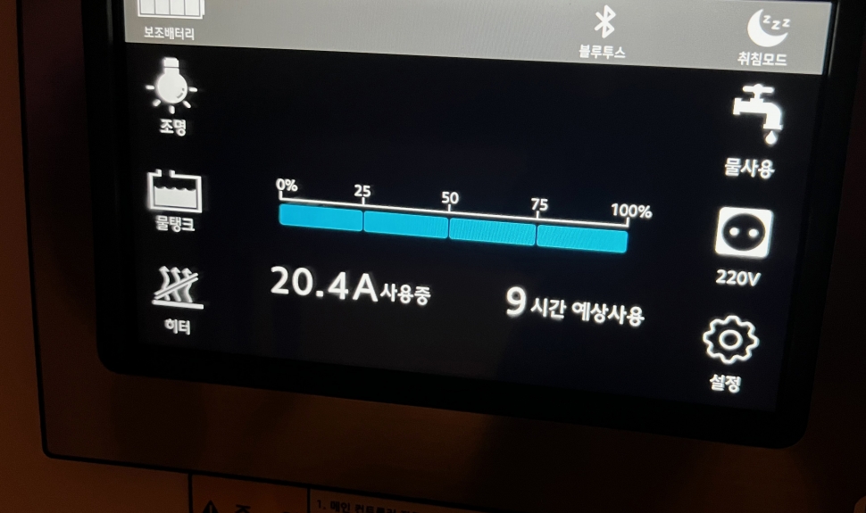 패널에는 전자레인지를 돌릴 때, 에어컨을 돌릴 때, 220V를 사용할 때마다 전력 사용량 총계가 나오고 이 상태로 얼마나 지속할 수 있는지를 보여준다. 해변 주차장인 것을 고려해 엔진을 켜지 않고 배터리로 버텨본다.
