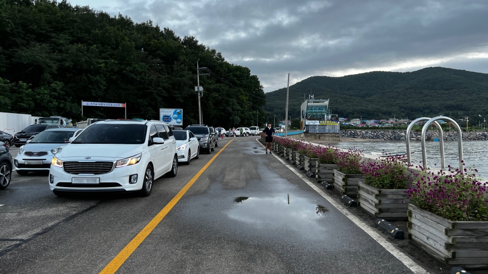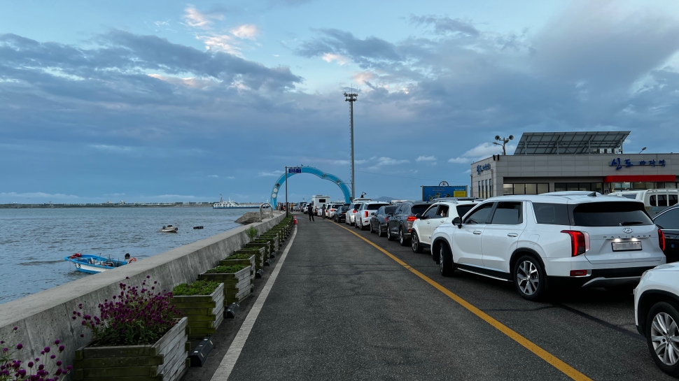 저녁 6시. 아직 해가 쨍쨍한데 내일 아침 첫 배를 타려는 사람들은 선착장에 차를 줄 세웠다. 어림잡아 20~30대. 아마도 출근을 위해 반드시 일찍 떠나야 하는 사람들일 듯. 배도 보통은 아침 7시부터 운항하지만 내일은 새벽 5시부터라고 한다. 선착장 한쪽에 차를 세우고 저녁을 먹으며 바라보니 점점 줄이 늘어난다.