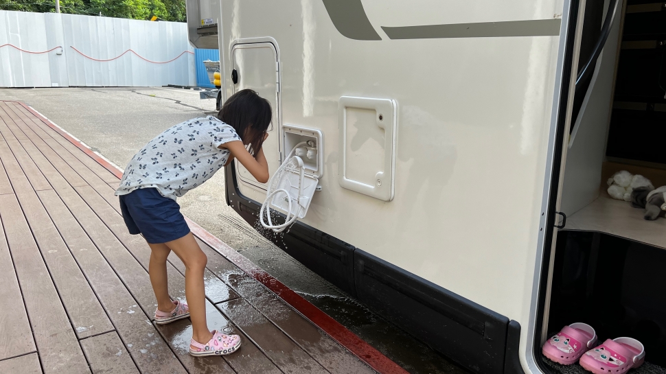 현대 포레스트 캠핑카에서 이틀째 지내니 단점도 느껴진다. 침대에서 아이가 뒤척여도 차가 흔들린다. 어른이 걸어 다니거나 움직여도 흔들린다. 자다 깨기를 반복한 이유 중에 하나다. 대형 캠핑카에는 다리가 내려와 흔들리지 않도록 잡아주는데 이 차에는 그런 장치가 없다. 출렁이는 집이다.