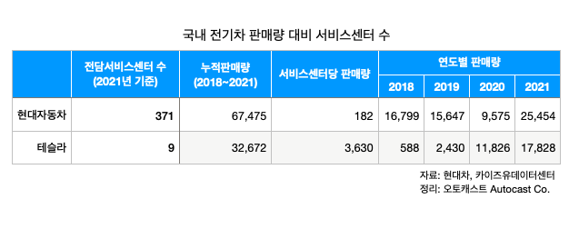 같은 기간 현대자동차그룹의 전기차 판매가 2018년 1만6799대, 2019년 1만5647대, 2020년 9575대대에서 2021년 2만5454대인 것과 비교하면 워크베이 수를 고려하지 않고 단순 서비스센터 수로 계산할 때 20배 이상 국산차의 서비스 인프라가 많다.