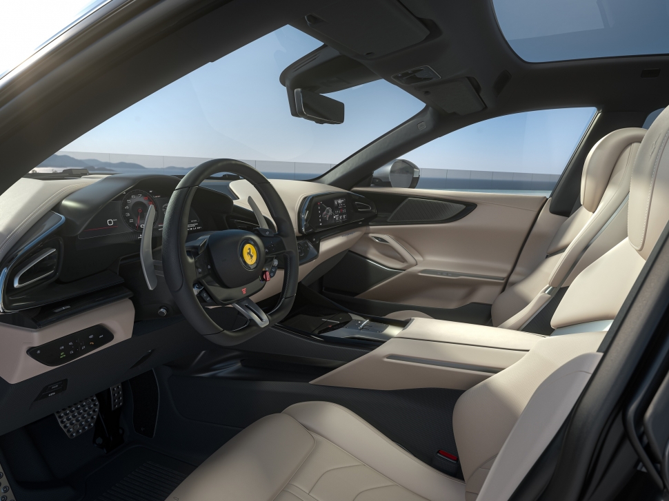 코치 도어 형태의 문을 열면 의외로 넉넉한 공간이 드러난다. 캐빈의 모든 부분은 의도적으로 콤팩트하게 설계했다. 운전석은 SF90 스트라달레에서 영감을 받았으며 조수석과 대칭을 이루고 있다. 조수석에 앉은 사람도 10.2인치 디스플레이를 통해 운전정보를 확인할 수 있다.