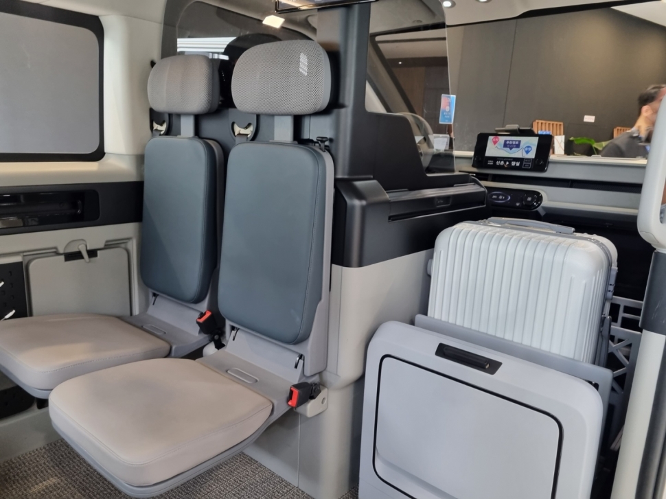 시트는 실리콘으로 제작함으로써 오염에도 강한 것이 특징이다. 맞은 편에는 접이식 좌석이 들어갔다. 이 역시 좌우로 슬라이딩할 수 있어 탑승객 편의성을 높였다. 쿠션의 경우 탈착도 가능하다.