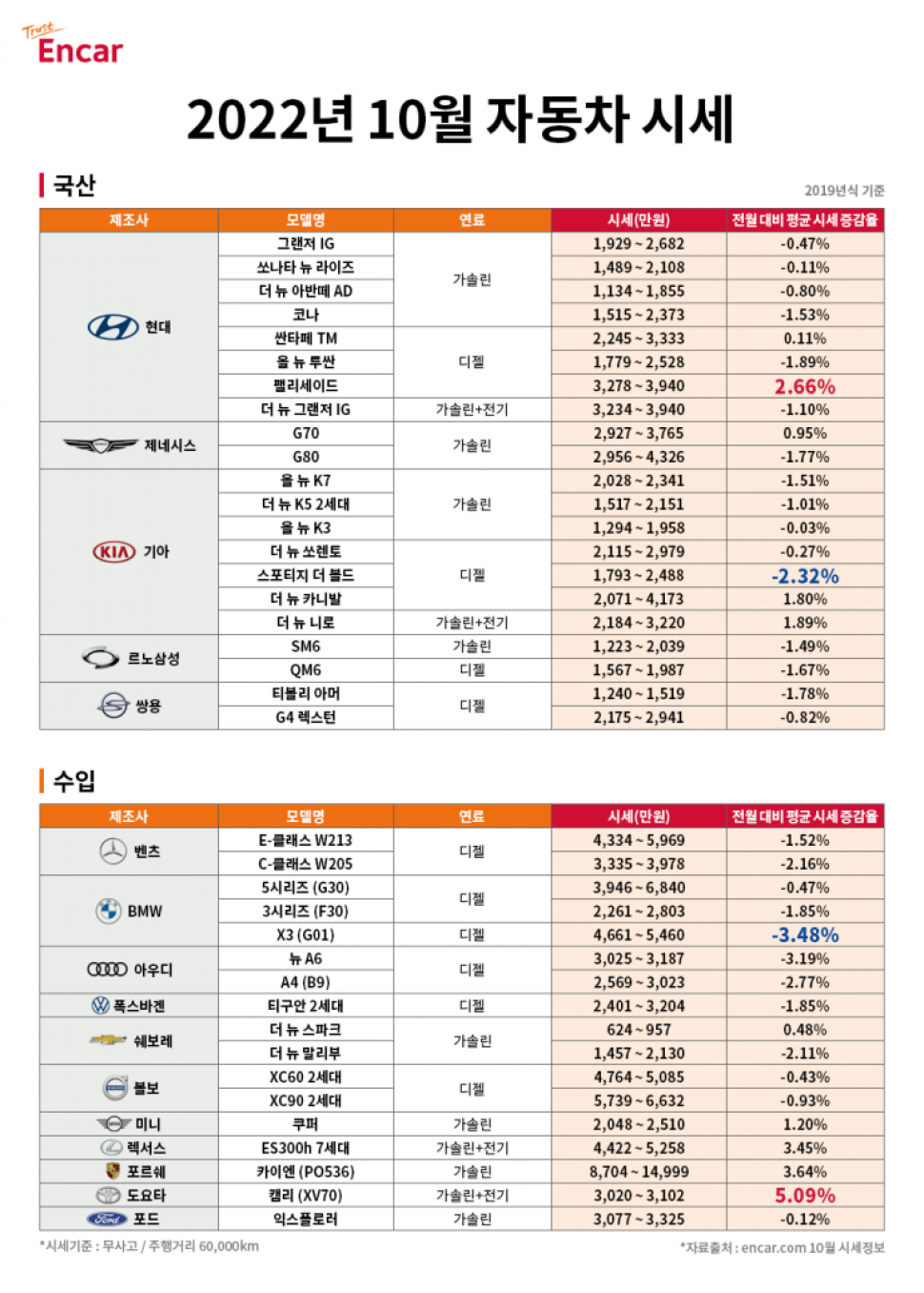엔카닷컴이 2022년 10월 중고차 시세를 공개했다. 이는 엔카닷컴 빅데이터를 토대로 현대자동차, 기아, 르노코리아자동차, 쌍용자동차 등 국내 완성차 브랜드와 벤츠, BMW, 아우디 등 수입차 브랜드의 2019년식 인기 차종 중고차 시세를 분석한 결과다. 주행거리 기준은 60,000km이며 무사고 차량을 대상으로 분석했다.