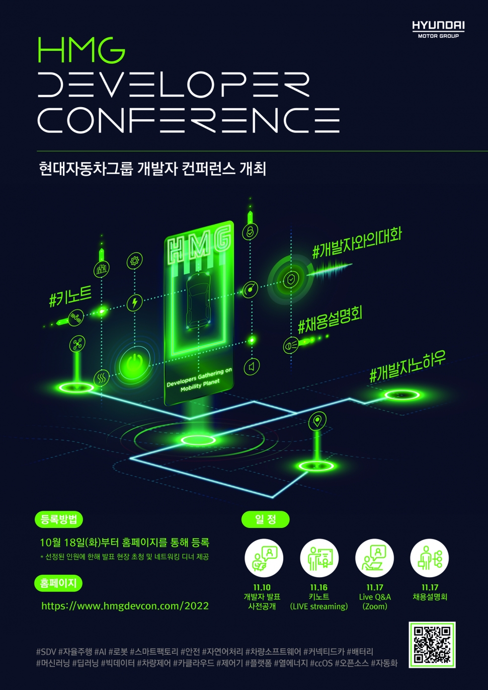 현대차그룹이 오는 11월 16일부터 17일까지 이틀간 HMG 개발자 컨퍼런스를 개최한다고 밝혔다. 이를 위해 10월 18일부터 컨퍼런스 참가자 등록을 시작한다.