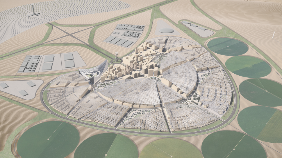 사막 도시는 뜨거운 태양열, 높은 기온, 거센 모래 폭풍을 막기 위한 구조로 도시를 구성했다. 지붕 구조물, 건물, 보행로, PBV와 대중교통이 다니는 도로망, 배후지 및 공원 등으로 설계됐다.