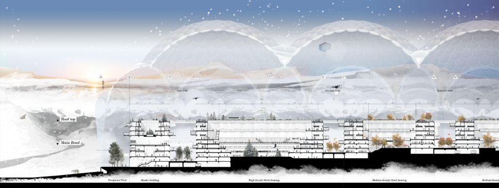 먼저, 극지 도시는 눈으로 덮인 영구 동토층을 제거하고 드러난 암반 위에 대형 돔을 건설하는 콘셉트다. 돔 내부는 야외 활동 및 식물 서식이 가능할 정도의 냉대 기후를 조성하고 도시를 건설할 수 있도록 설계했다. 도시는 해안가에 있으며, 중심부에 녹지를 배치하고, 외곽 지역으로 갈수록 도시의 밀도가 높아진다.