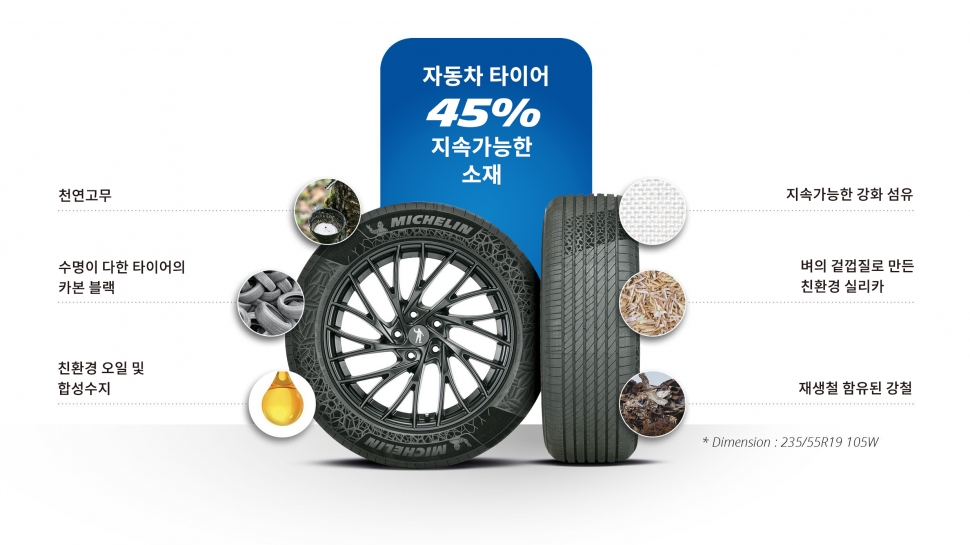 한편 미쉐린은 세계 최초로 각각 45% 및 58%의 지속가능한 소재로 제조된 일반 차량용 타이어와 버스 전용 타이어를 공개했다. 도로 주행이 승인된 두 타이어는 기존 타이어 제품들과 동일한 수준의 성능을 구현한다.