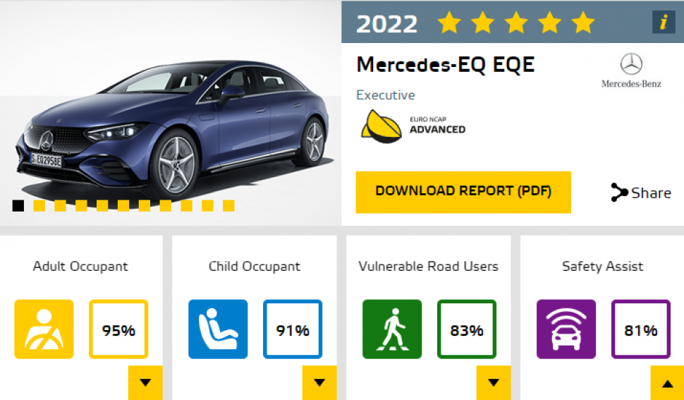 더 뉴 EQE는 성인 탑승자 보호 부문에서 95%로 가장 높은 점수를 받았다. 더 뉴 EQE는 측면 장애물 충돌 및 기둥 측면 충돌 평가에서 만점에 가까운 점수를 받았다. 이어 어린이 탑승자 보호 부문에서는 전면 오프셋 충돌과 측면 장애물 충돌 평가에서 모든 중요 신체부위를 안전한 수준으로 보호하며, 91%를 기록했다.