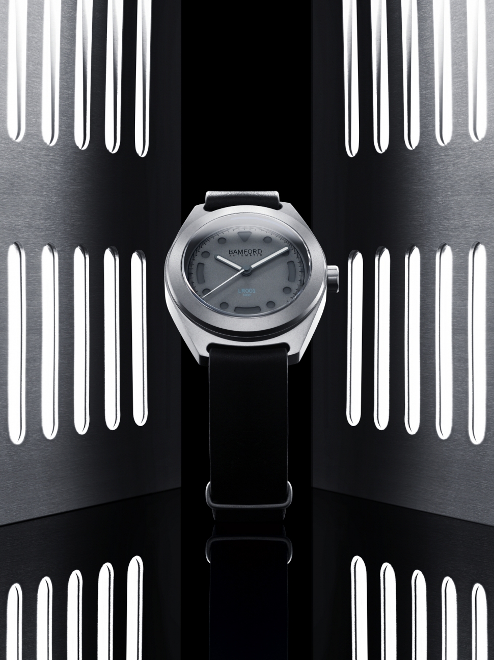 LR001 모델은 그레이 티타늄으로 감싸져 있으며 기술적으로 정교함을 강조하는 그레이 톤의 컷어웨이 다이얼을 적용했다. 컷어웨이 다이얼 아래로 숨어있는 조명에서는 녹색 빛을 은은하게 비춰 낮은 조도에서도 다이얼을 확인할 수 있다. 다이얼의 6시 방향에는 뱀포드의 시그니처 컬러인 아쿠아 블루로 'LR001' 로고를 은은하게 새겨 넣었다.